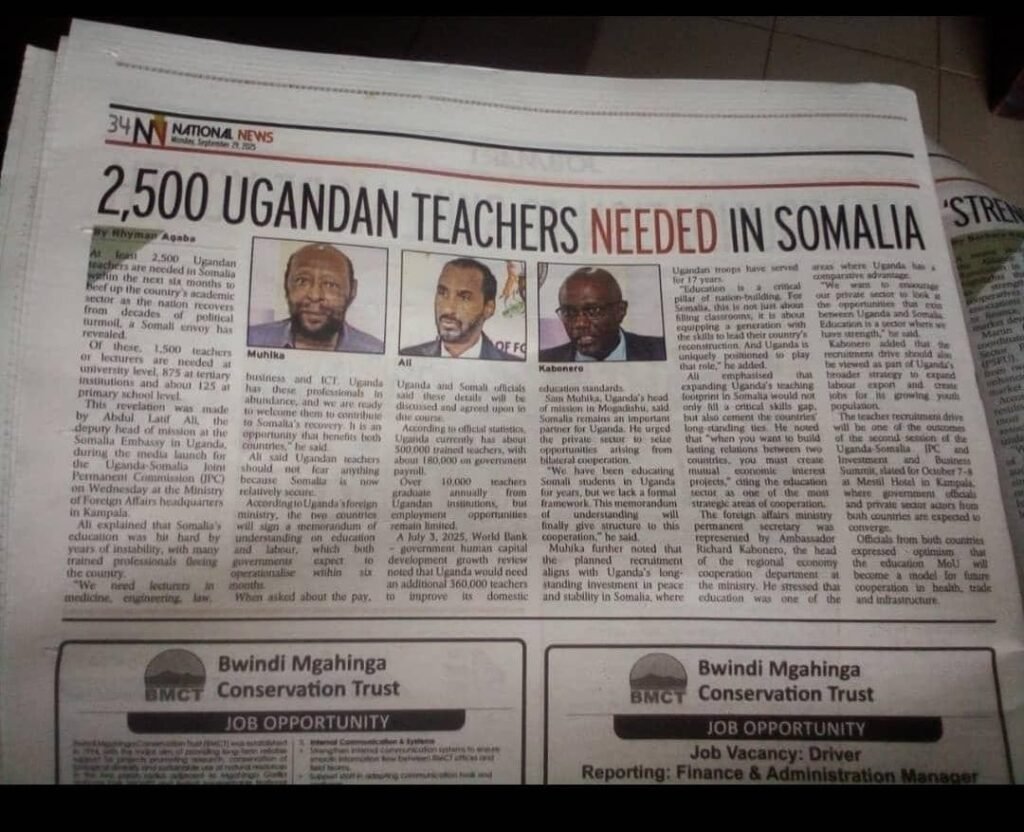 A Somali study has revealed that at least 2,500 Ugandan teachers are needed in Somalia within the next six months to help rebuild the country’s academic sector as it recovers from decades of political turmoil.
