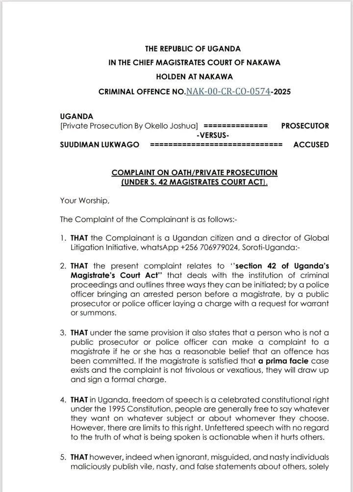 The legal action, filed at the Nakawa Chief Magistrates Court under Criminal Offence No. NAK-00-CR-C0-0574-2025, accuses Lukwago of criminal libel and spreading harmful falsehoods.
