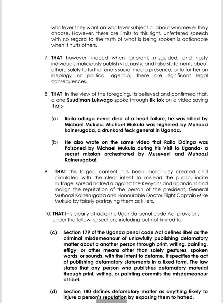 According to the court documents, the case stems from a video circulated online in which Suudiman Lukwago is alleged to have made several incendiary statements. He reportedly claimed that Raila Odinga “never died of a heart failure, he was killed by Michael Mukula,” and alleged that Mukula was “hired by Muhoozi Kainerugaba, a drunkard feck general in Uganda.”