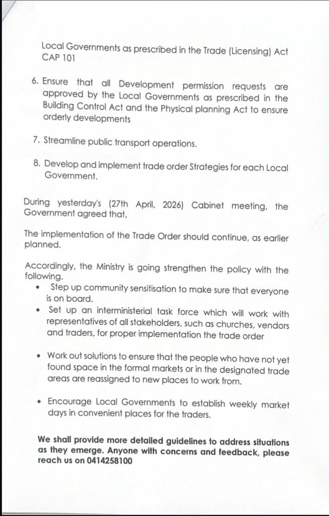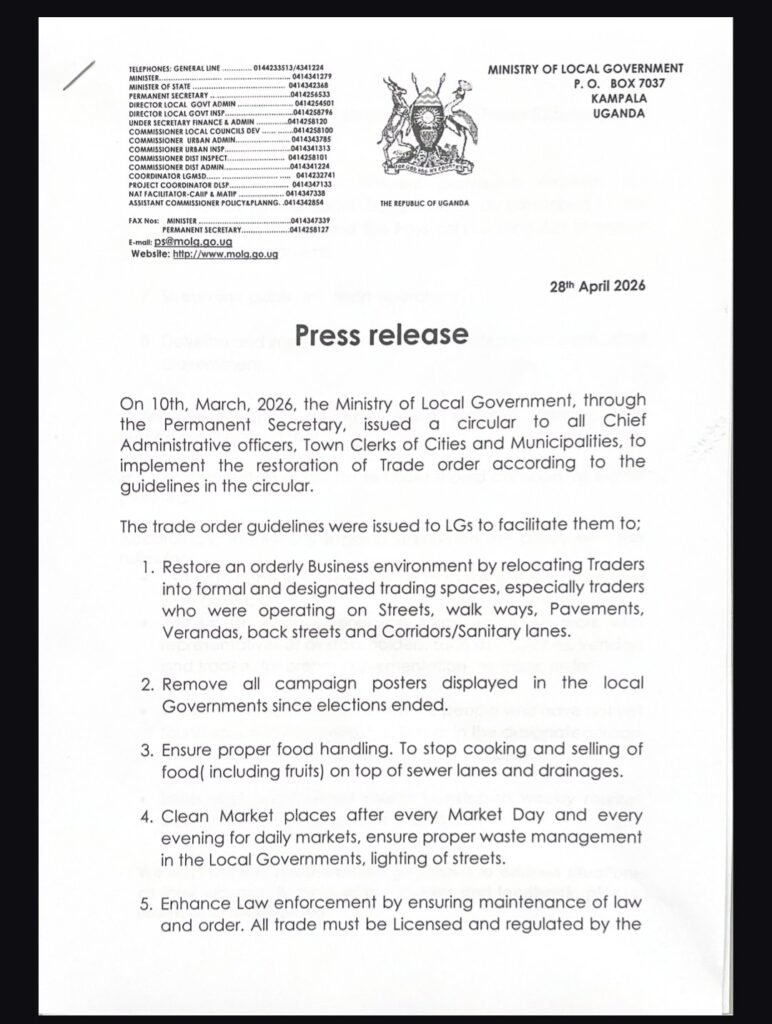 On 10th March 2026, the Ministry of Local Government issued a circular to all Chief Administrative Officers, Town Clerks of Cities, and Municipalities, directing them to implement trade order restoration according to established guidelines.