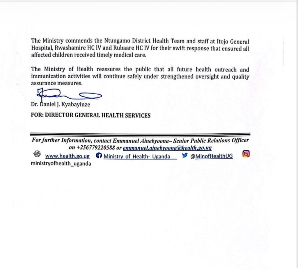 The Ministry commended the swift response of the Ntungamo District Health Team and staff at the receiving health facilities, while reassuring the public that all future health outreach and immunization activities will continue under strengthened oversight and quality assurance measures.