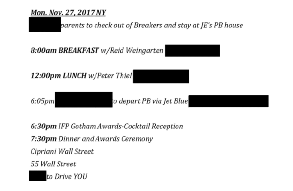 · Tentative plans for a breakfast party with Microsoft founder Bill Gates in December 2014. Gates has since stated that meeting Epstein was a “mistake.”