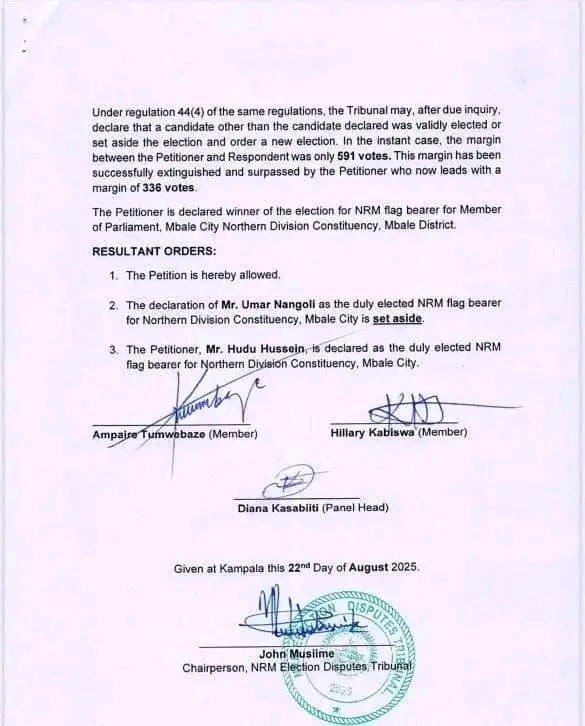 The NRM Election Disputes Tribunal, in a ruling dated August 22, 2025, nullified the earlier declaration of Mr. Umar Nangoli as the winner. The tribunal’s inquiry revealed that errors in the initial count had led to Hussein’s narrow loss by 591 votes. Upon a thorough re-assessment of the votes, the tribunal found that Hussein had, in fact, won the primary by a margin of 336 votes.