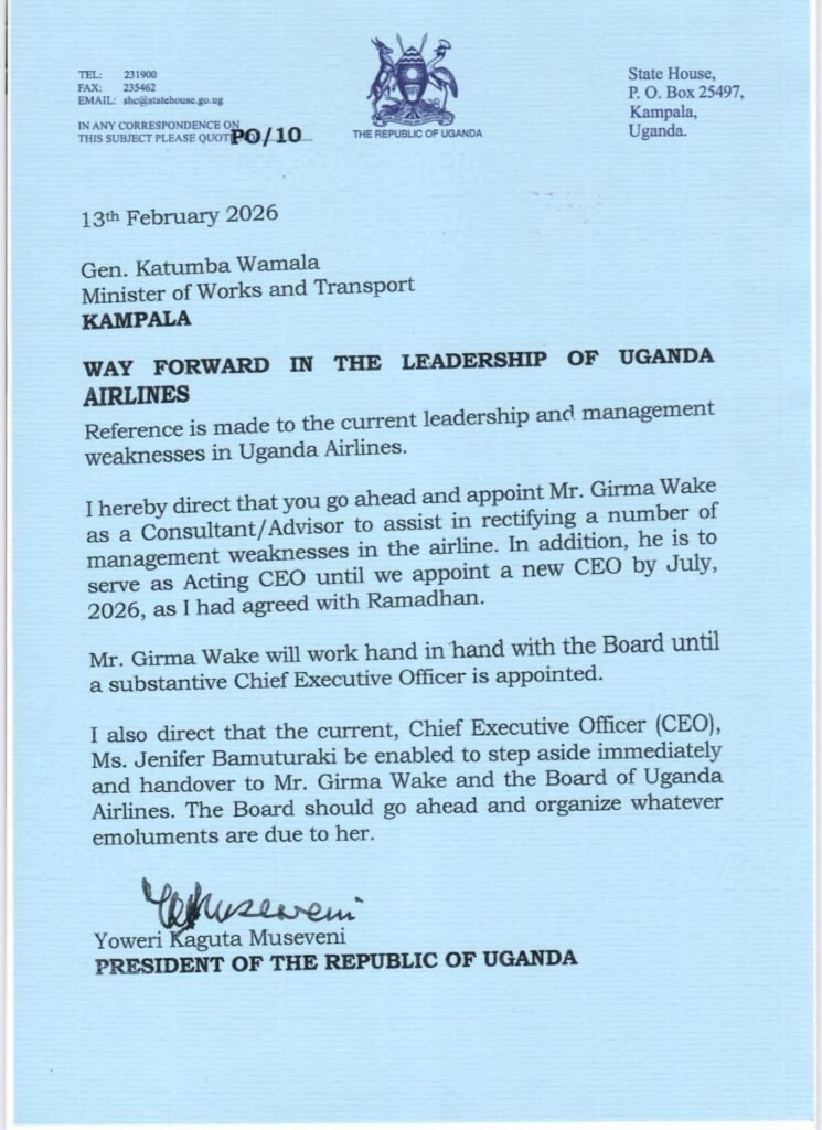 The directive, addressed to Minister of Works and Transport Gen. Katumba Wamala, cites “current leadership and management weaknesses in Uganda Airlines” as the basis for the leadership change.