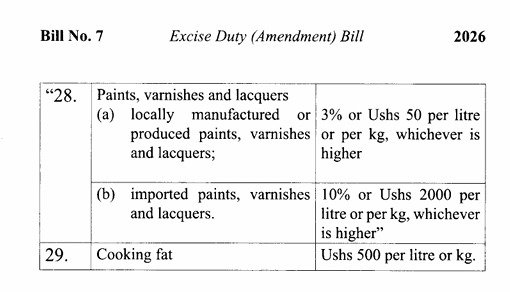 · Paints and varnishes: Locally manufactured or produced paints, varnishes, and lacquers will attract a levy of UGX 50 per litre or per kilogram, whichever is higher, adding to the cost of construction and household maintenance.