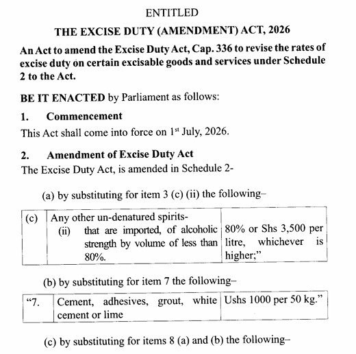 · Cement and adhesives: The Bill seeks to impose an excise duty of UGX 1,000 per 50 kilograms on cement, adhesives, grout, white cement, and lime. Industry players warn the move will increase construction costs across the country.