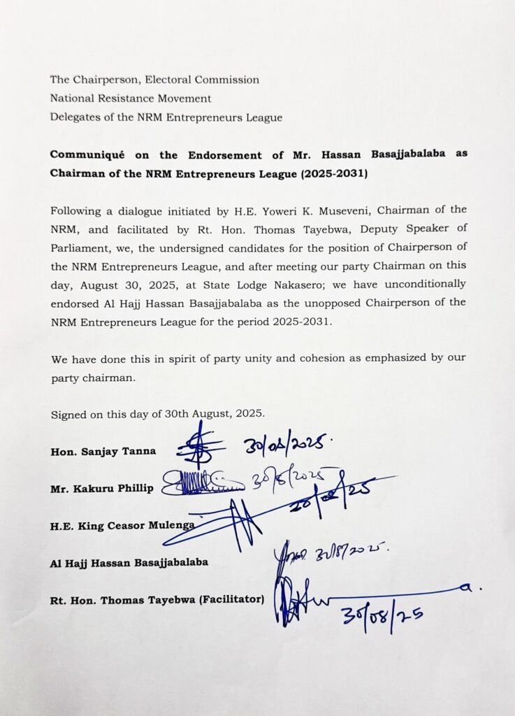 Kampala, August 30, 2025 – In a significant display of party unity, all aspirants for the chairmanship of the National Resistance Movement (NRM) Entrepreneurs League have unconditionally endorsed Al Hajji Hassan Basajjabalaba as their unopposed leader for the 2025-2031 term.