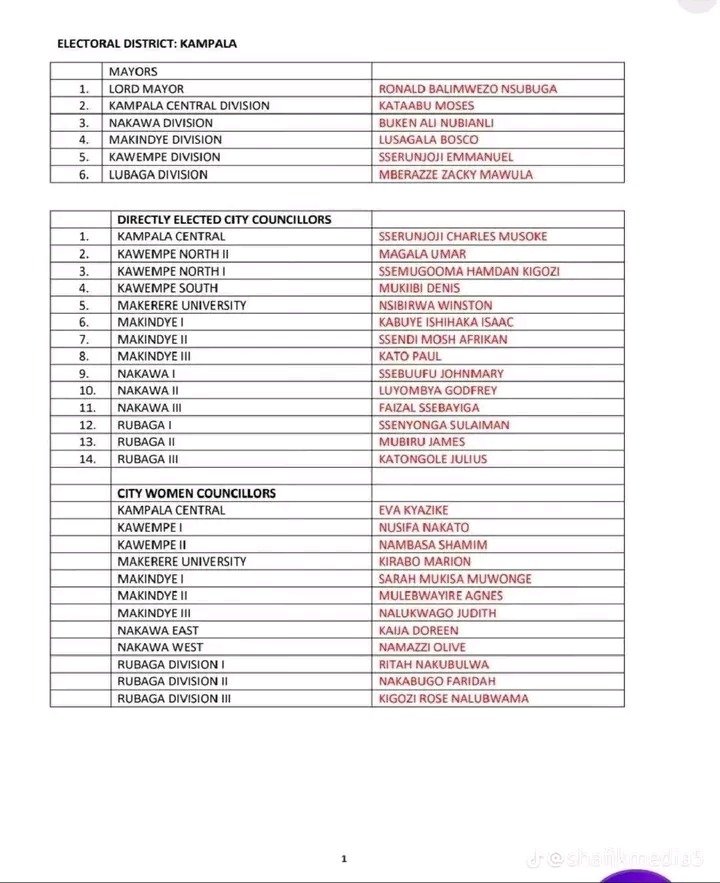 The list also includes all directly elected city councillors and women councillors for the five divisions, ensuring the party has representation in every electoral district of the city. Notable names include Charles Musoke Sserunjoji for Kampala Central and Eva Kyazike as the City Woman Councillor for the same division.