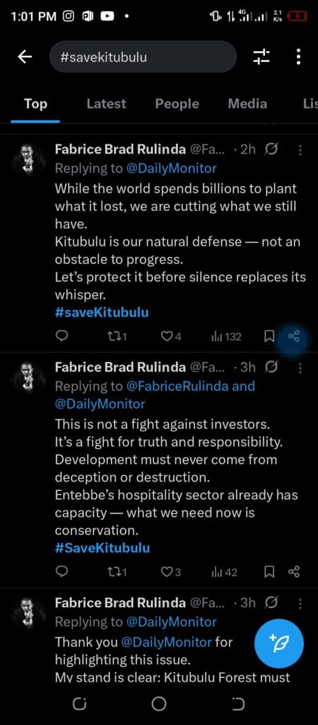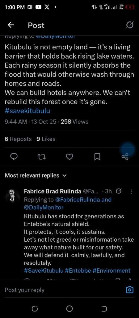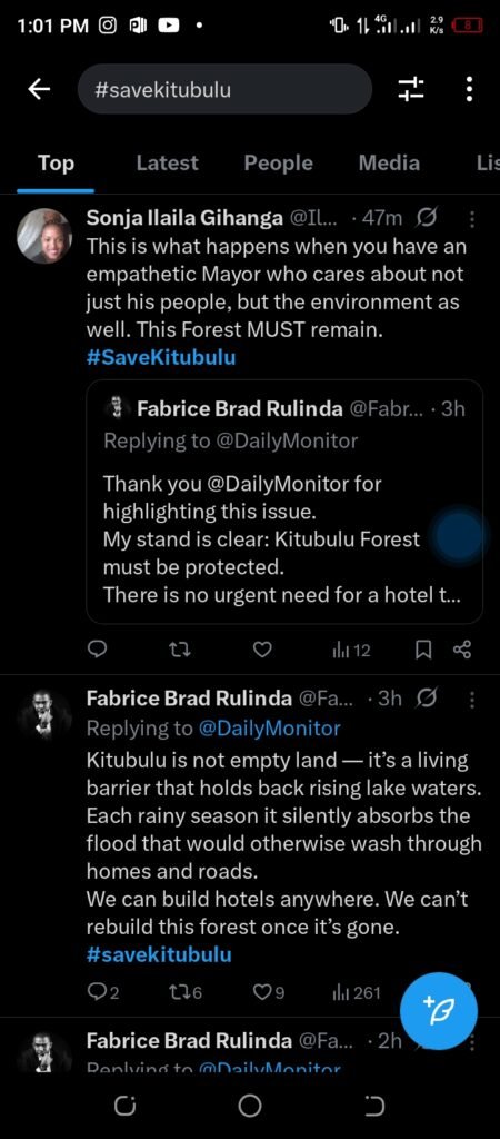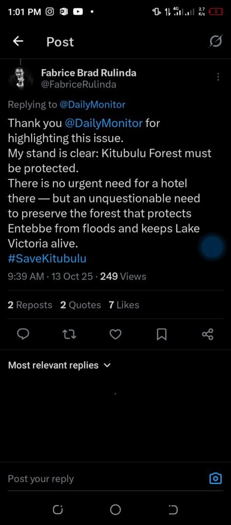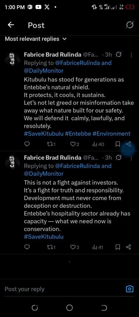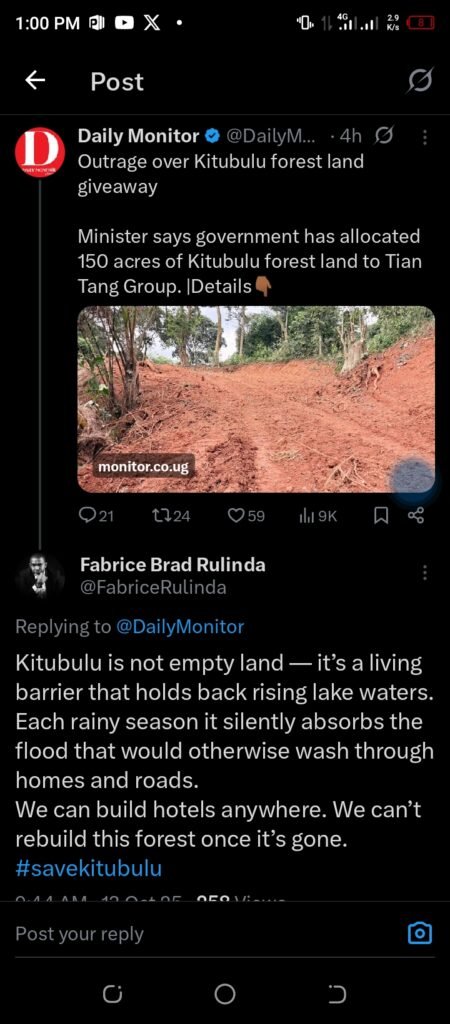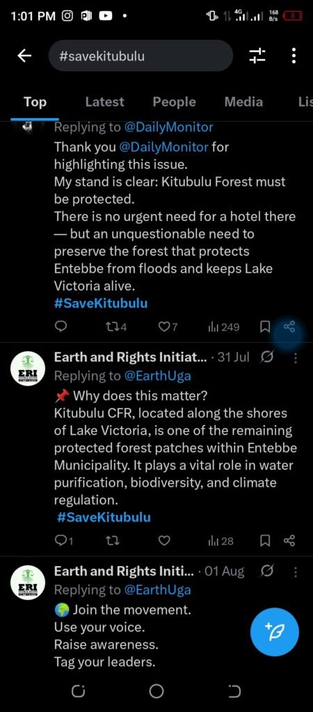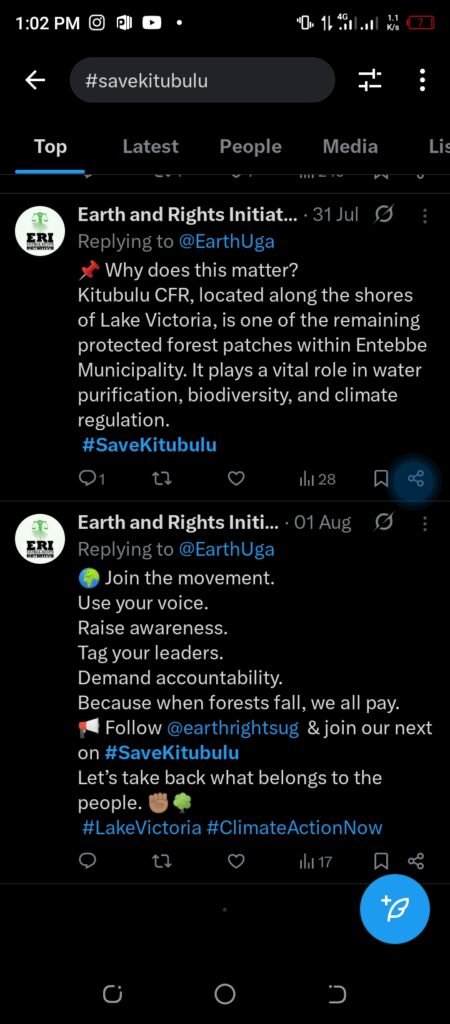 The environmental organization Earth and Rights Initiative has also joined the chorus of dissent, highlighting the forest’s critical ecological role. In earlier posts, the group explained that Kitubulu CFR is “one of the remaining protected forest patches within Entebbe Municipality,” playing a “vital role in water purification, biodiversity, and climate regulation.”