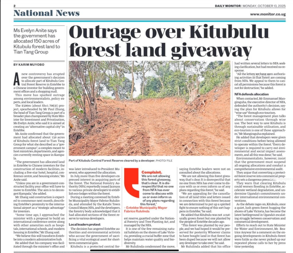 A new controversy has erupted over the government’s decision to allocate part of Kitubulu Central Forest Reserve in Entebbe to a Chinese investor for building government offices and a shopping mall. This move has sparked outrage among environmentalists, policy experts, and local leaders.