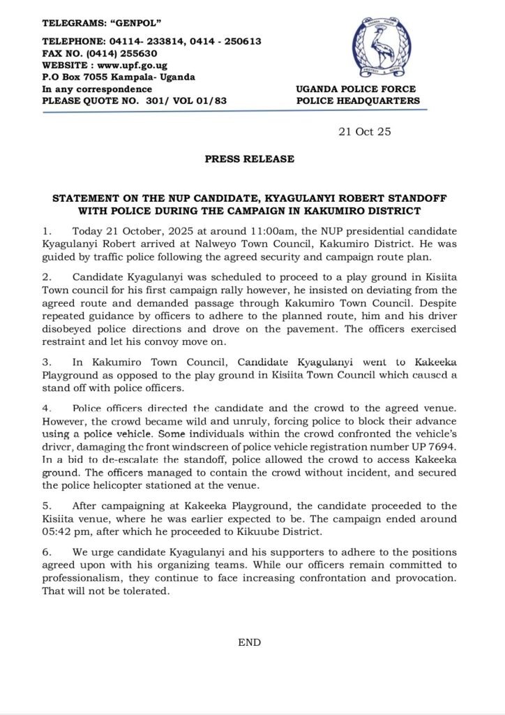 The Uganda Police Force concluded its statement with a warning, urging “candidate Kyagulanyi and his supporters to adhere to the positions agreed upon with his organizing teams.” It further stated that while officers remain committed to professionalism, “they continue to face increasing confrontation and provocation. That will not be tolerated.”