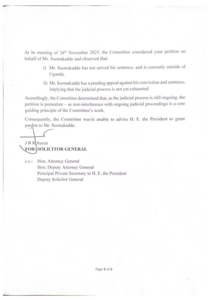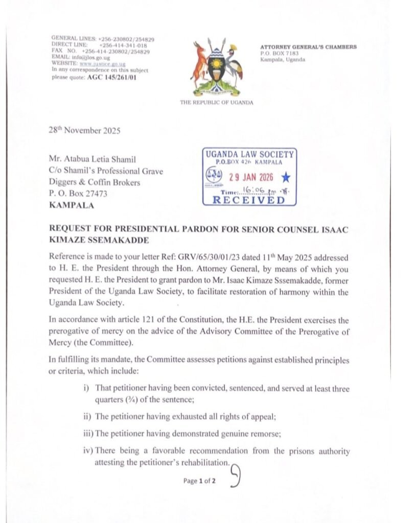 The rejection was communicated in a letter dated 28th November 2025 from the office of the Attorney General to Mr. Atabua Letia Shamil, who had written to President Yoweri Museveni on behalf of Ssemakadde in May 2025. The stated goal of the petition was to “facilitate restoration of harmony within the Uganda Law Society.”