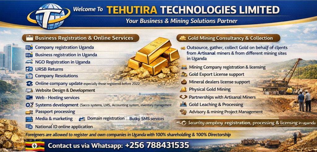 • Company Registration/Online Update & Reinstatement,Business Registration,NGO &CBO Registration,National ID Processing,Passport processing,Website design & System Development,Domain registration,Web- Hosting services,Bulky sms services,Real Estate advisory,URSB & URA Returns filling,Media & Marketing,Consultancy,Transport & Logistics