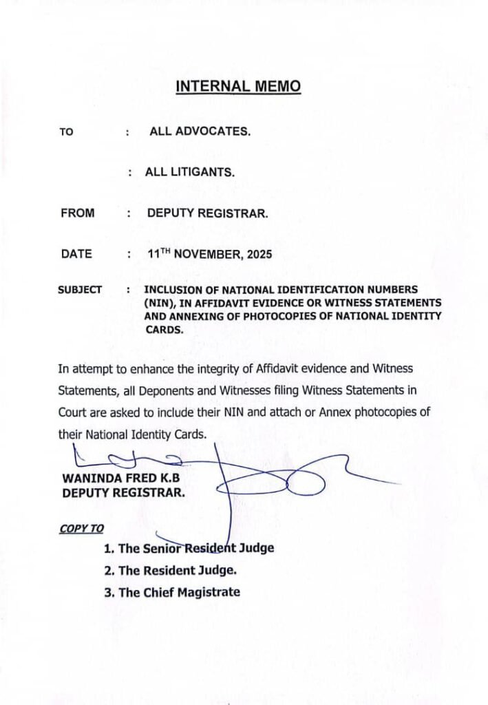 Simultaneously, the judiciary has issued an internal memo mandating the inclusion of NINs and photocopies of national ID cards for all affidavits and witness statements filed in court. The directive, signed by Deputy Registrar Waninda Fred K.B., is described as an attempt to “enhance the integrity” of legal evidence.