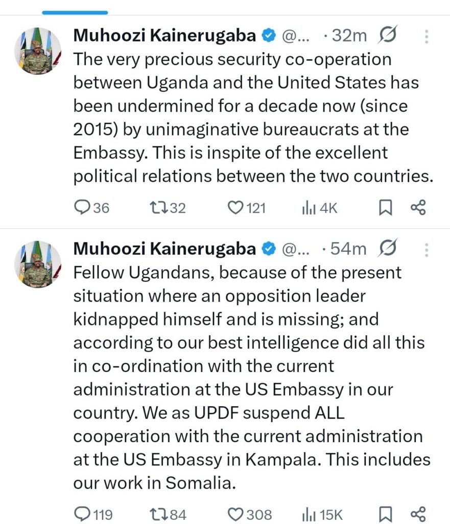In the now-deleted statements on X (formerly Twitter), Gen. Muhoozi alleged that “unimaginative bureaucrats” at the U.S. Embassy had undermined Uganda-U.S. security cooperation for nearly a decade. He further claimed that an opposition leader had “kidnapped himself” and disappeared with the coordination of the embassy’s administration.