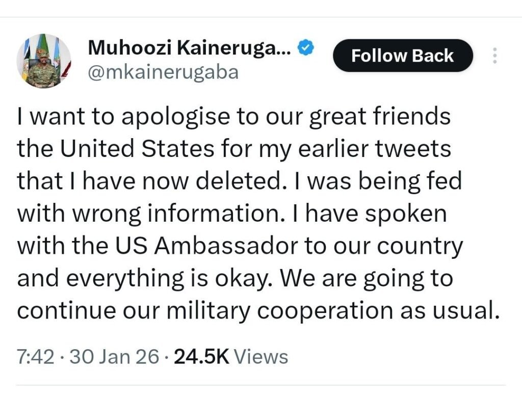 However, Gen. Muhoozi later reversed his position, clarifying that the claims were based on faulty intelligence. He stated he had spoken directly with the U.S. Ambassador to Uganda and confirmed that “everything is okay,” assuring that military cooperation would continue as usual.
