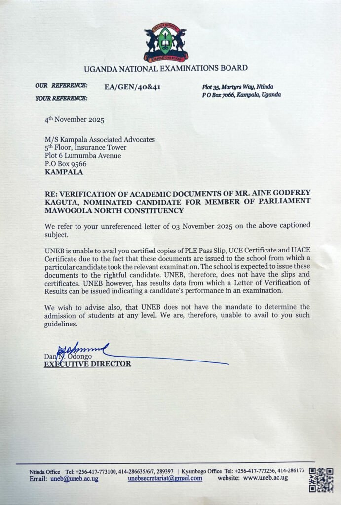 KAMPALA – The Uganda National Examinations Board (UNEB) has stated it does not possess certified copies of the academic documents for Mr. Aine Godfrey Kaguta, the nominated candidate for Member of Parliament for Mawogola North Constituency and brother to President Yoweri Museveni.